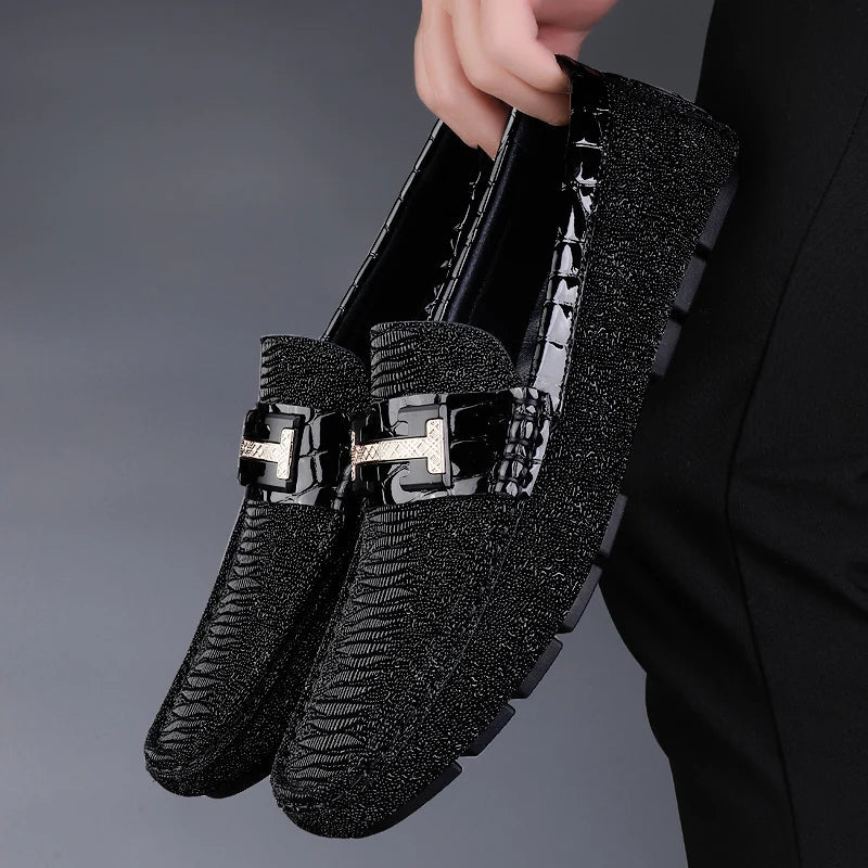 Designed for presence, these genuine leather loafers offer a sleek finish and a bold metal accent, ensuring a refined look with exceptional comfort.