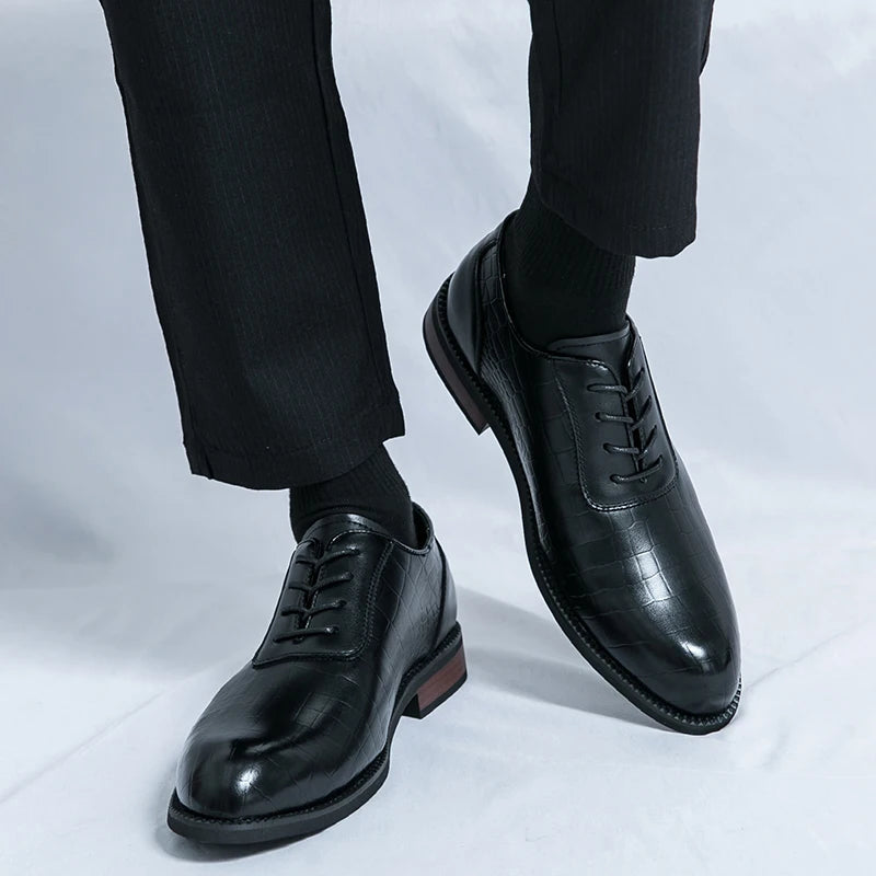 Polished and sleek with croc-embossed leather, these premium oxfords exude classic elegance with a burnished finish and comfort-focused design, ideal for any event.