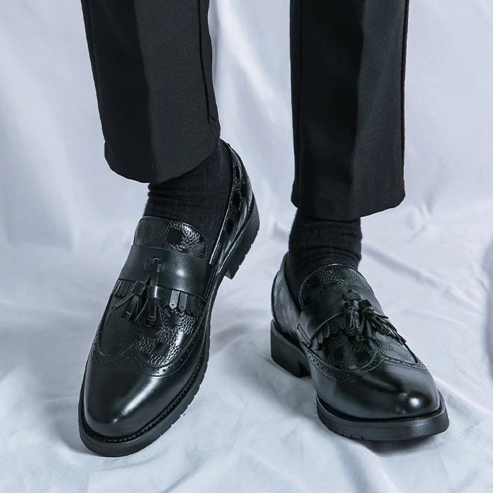 Elevated with signature kiltie fringe and tassels, this timeless wingtip loafer features a polished genuine leather upper and a comfortable, non-slip design, ideal for any event.
