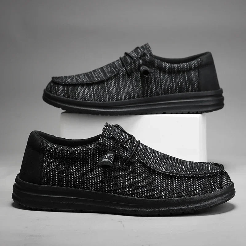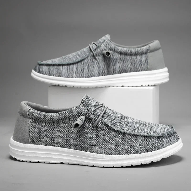 Minimalist style defines a lightweight shoe with a breathable upper featuring a cushioned footbed and a durable rubber sole.