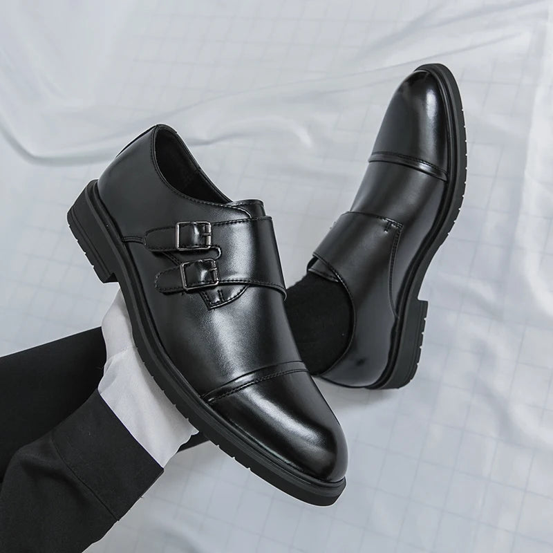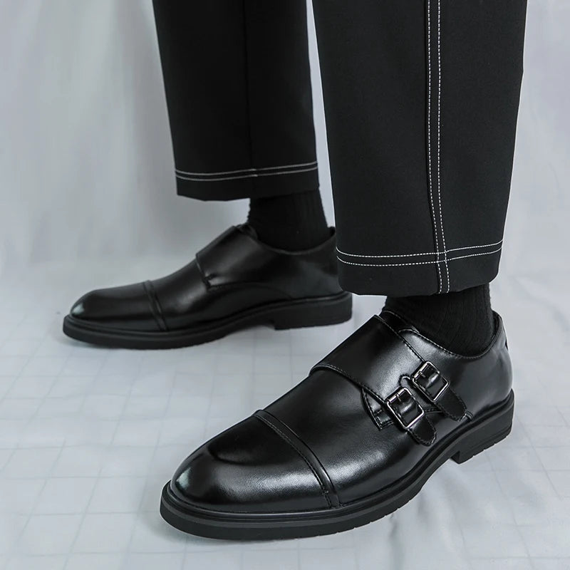 A sleek, burnished profile and dual monk straps bring a premium edge to these classically refined genuine leather shoes, designed for everyday comfort and luxury.