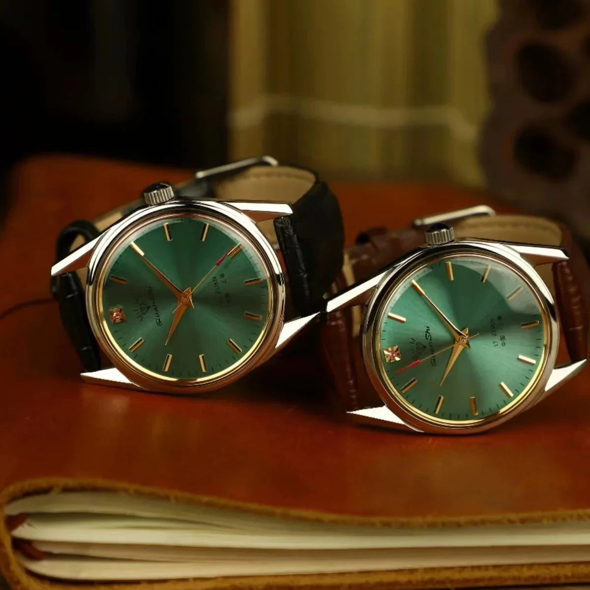 A Swiss quartz timepiece brings a captivating aqua sunburst dial paired with sleek gold-tone markers that exude understated elegance with its polished and minimalist design.